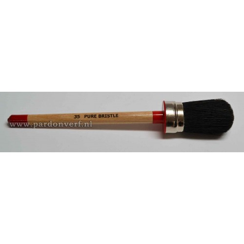 Ovaal model zinkwitter, met eerste kwaliteit zwart Chinees varkenshaar. Voorzien van vernikkelde bus, gelakte houten steel met kunststof kap.